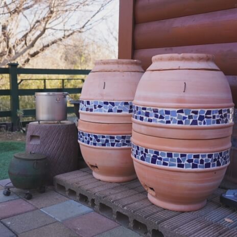 庭先の壺とログハウスのぬくもりが心地よい、小さな癒しの空間。